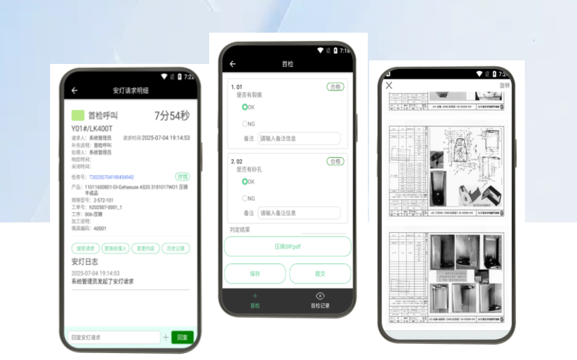 当任务首检触发后,大发在线登录官网-大发(中国) 系统会自动推送首检任务至品质人员终端。品质人员接收任务后,前往指定机台执行首检,可通过终端实时查看产品SIP(标准检验程序),并支持拍照上传首检结果,最终完成首检确认流程。