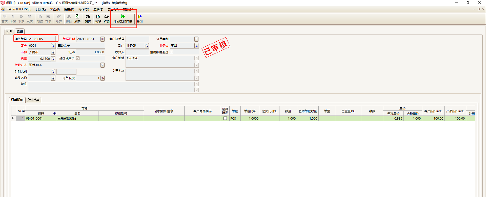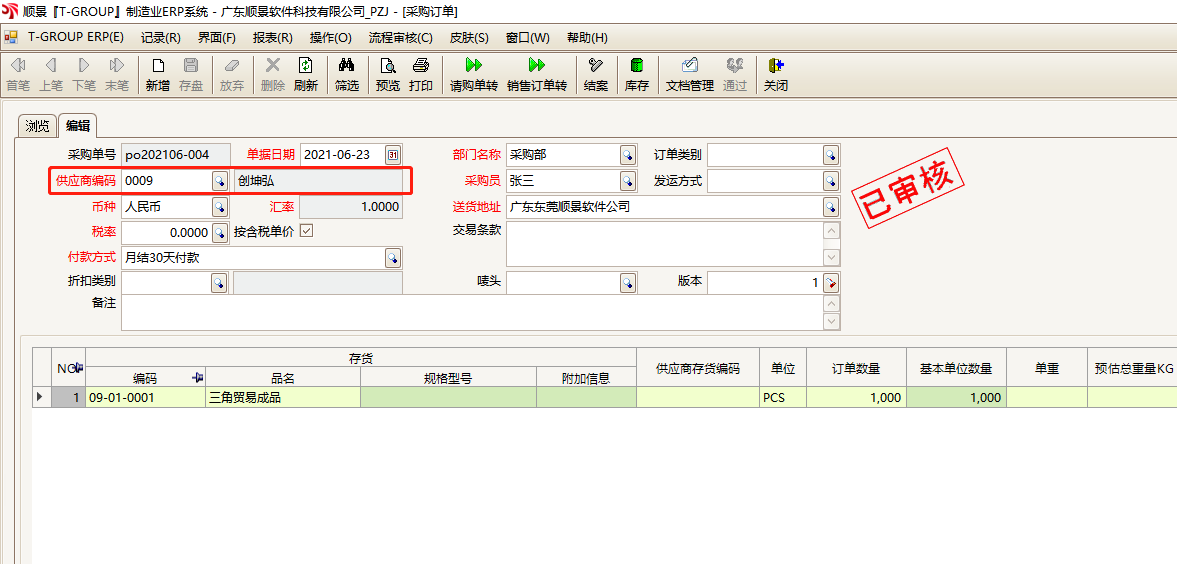 5.现在顺景ERP内就会自动在A公司库内生成一张采购订单。