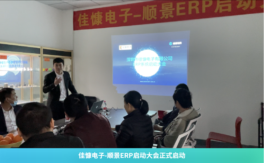 近日,佳慷电子有限公司-顺景ERP系统启动大会,在佳慷公司顺利召开,佳慷电子李总及各部门主管参与了本次启动大会,顺景公司项目顾问程顾问,对佳慷公司的ERP系统项目的实施规划、实施方法及注意事项等进行了汇报。